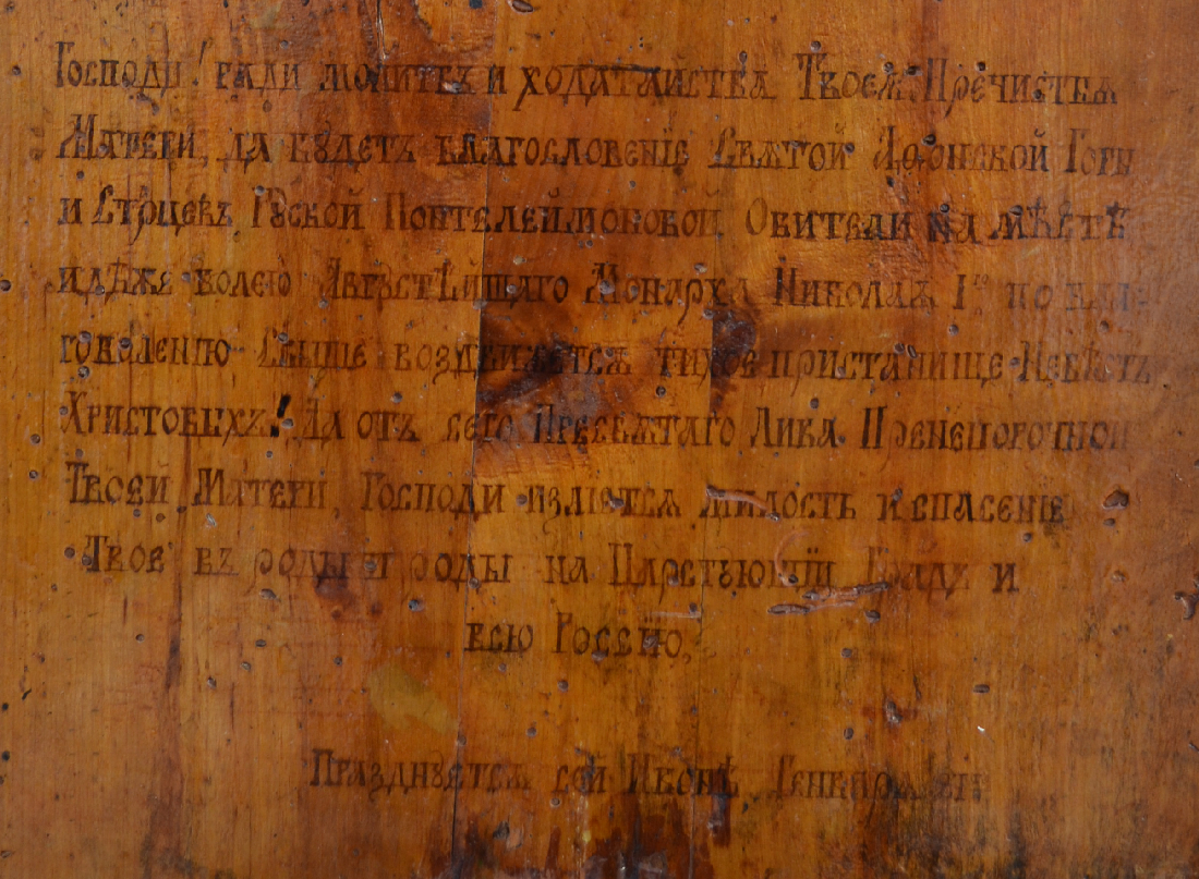 Когда старший клирик Вышенского монастыря игумен Пимен решил отреставрировать старый киот, достав икону, с обратной стороны он прочитал надпись: «Господи! Ради молитв и ходатайства Твоея Пречистыя Матери, да будет благословение Святой Афонской Горы и Старцев Руской Понтелеймоновой обители на месте идеже волею Августейшаго монарха Николая I-го по благоволению свыше воздвижется тихое пристанище невест Христовых! Да от сего Пресвятаго Лика Пренепорочной Твоей Матери, Господи излиется милость и спасение Твое в роды и роды на Царствующий Град и всю Россию. Празднуется сей иконе Генваря 21-го».